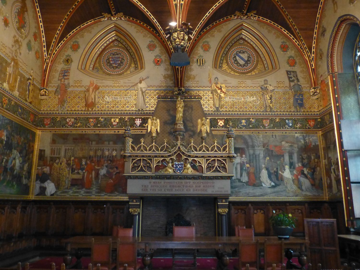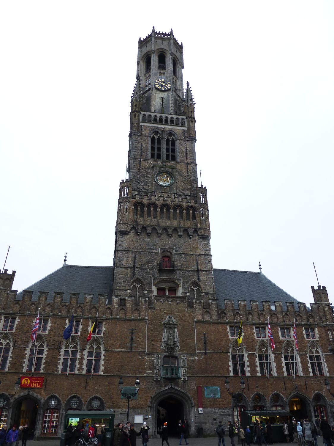 On our next day, we explored the Stadhuis (the city hall) which had an amazing upper room filled with fascinating murals.  After that, we went to the Belfort, where we climbed a steep tower, saw the bells and enjoyed a stunning view over Bruges.
