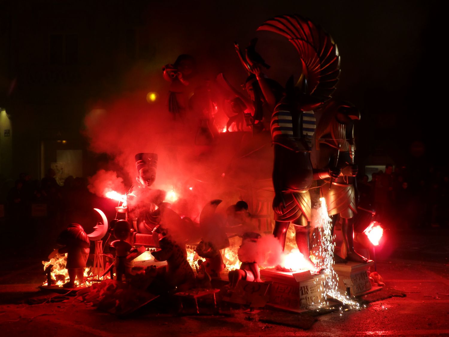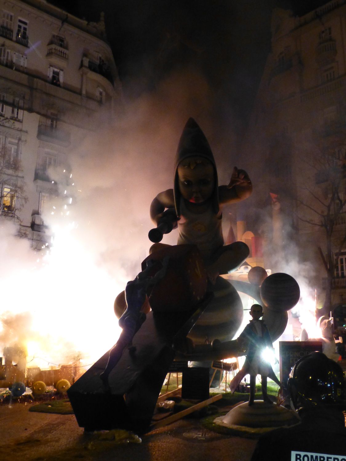 First to go are the children’s ones…we watched the Egyptian themed one above being burned.  It started with the ninot being stuffed with fireworks, gun powder and gasoline…then the fuse above our heads was lit and fireworks went off and then it went up!